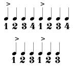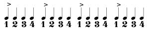 При этом на «РАЗ» приходится акцент, обозначаемый - >. Акцент, в этом случае, называется сильной долей. Остальные доли - слабые. Неизменное чередование сильных и слабых долей, образует метр - пульс любой музыки.