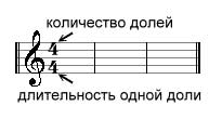 Количество долей, и их длительность определяет размер такта и, в большинстве случаев, всего произведения. Размер записывается дробью в начале произведения: