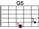Нота, от которой построен рower - аккорд, другими словами тоника аккорда, выделена красным. Поскольку это нота G, а интервал между звуками квинта (по латински - пять), сокращенно аккорд записывается как G5. Пальцы левой руки обозначены арабскими цифрами, так же, как в нотах.