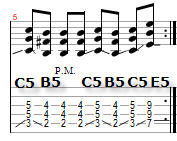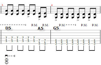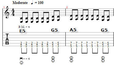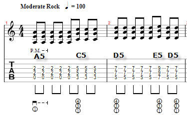 Двигаясь из аккорда G5 в A5 и обратно, не меняйте расположение пальцев. Старайтесь не прерывать работы медиатора, пусть левая рука подстраивается под правую, а не наоборот.