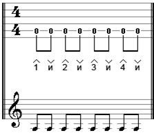 При игре 8-ми нотами удары вниз будут совпадать с долями метра 1, 2, 3, 4. Удары вверх приходятся между долей, на «и»: