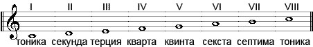 Если сыграть все звуки лада от тоники до ее октавного повторения, получится гамма. В большинстве случаев слова гамма и лад - это синонимы. Ступени лада обозначаются римскими цифрами, или именуются в зависимости от расстояния до тоники. Например: