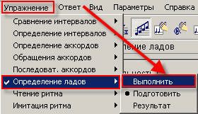 Открываем меню "Упражнение"->"Определение ладов"-> "Выполнить"