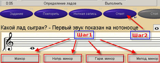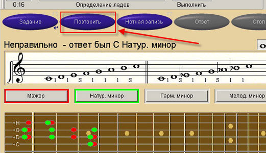 В случае отрицательного ответа можно прослушать еще раз, нажав на "Повторить", чтобы запомнить на слух разницу в звучании ладов. Затем жмите на "Задание" и слушайте следующий вариант лада.