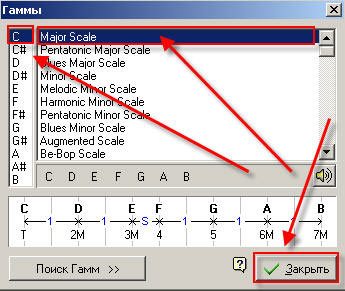 Выбираем нужную тональность и гамму, например, До (С) и гамму До-мажор (Major Scale) и нажимаем на "Закрыть"
