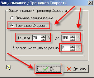 Выбираем "Тренажер скорости", Темп от 70 до 150 (смотрите по своим возможностям), Увеличение темпа за раз на 5. Затем жмем на ОК.