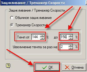 В нашем примере опять выбираем "Тренажер скорости", Темп от 144 до 156 (смотрите по своим возможностям), Увеличение темпа за раз на 2. Затем жмем на ОК.
