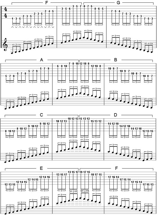 Принцип, по которому построено упражнение, очень простой. Вы играете в восходящем движении ноты До мажорной гаммы (до, ре, ми, фа, соль, ля, си) начиная с фа на 6 струне по 3 звука на каждой струне.
