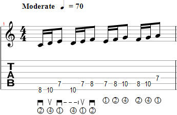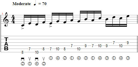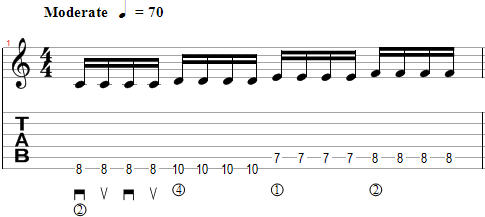 Начальный темп 70, но играем уже не восьмыми, а шестнадцатыми, так как штрих - переменный. Разгоняемся по принципу предыдущих двух упражнений.