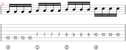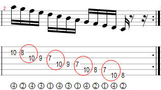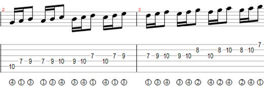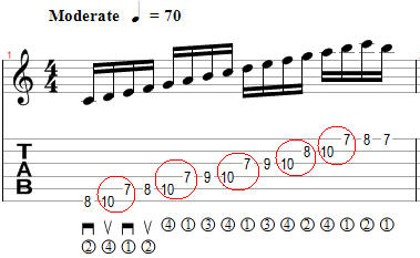 Дойдя до 1 струны, меняете позицию мизинцем и двигаетесь вниз по другой аппликатуре. Дойдя до шестой струны, меняете позицию указательным пальцем и снова движетесь вверх и т. д.