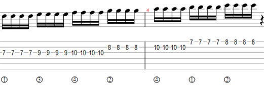 Упр. 4 - Подготовительное упражнение. В этом упражнении каждая нота играется четыре раза для того, чтобы пальцы "запомнили" расположение нот на грифе.