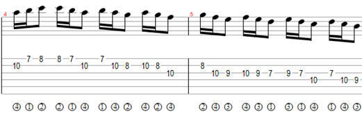 Используя принцип этих упражнений поработайте над минорной 2-х октавной гаммой. Вот как она выглядит в тональности Ля минор в V позиции: