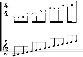 Внимание! Не стоит пытаться выучить упражнение целиком, сначала последовательно выучите и проиграйте вниз и вверх каждую из 7 аппликатур (например, по ОДНОЙ В ДЕНЬ), а уже потом соедините их, используя указанный принцип.