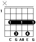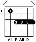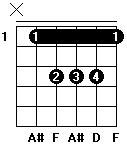 1. Сначала играете аккорд Ля-диез мажор (А#) в 1 позиции.