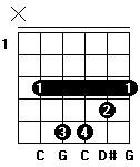 2. Затем играете аккорд До-диез мажор (С#) в 4 позиции.