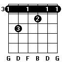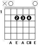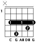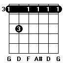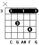 Или самостоятельно, поместив указательный палец на 3 лад, поставьте аккорд, прижимая струны пальцами, указанные в аппликатурной сетке. Извлеките аккорд нисходящим ударом правой руки.