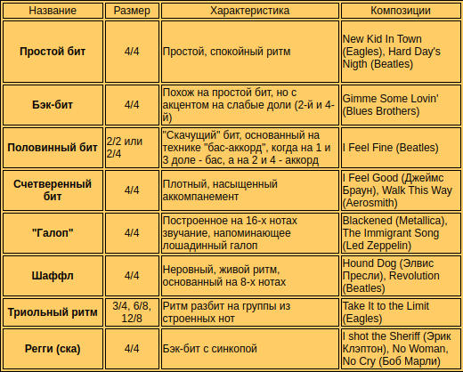 Перечислим ритмы или грувы с указанием размера, характеристик, а также некоторые композиции, построенные на этих ритмах.